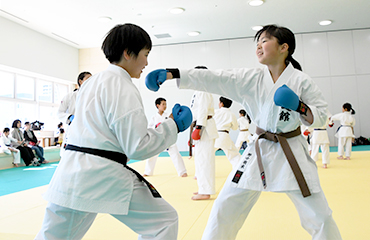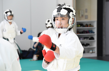 組手は防御と攻撃を一体で行います。手の防具だけを着用して組手練習を行います。